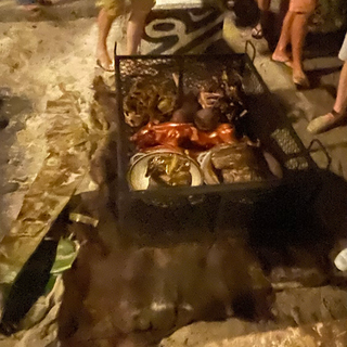 De visade upp traditionella polynesiska instrument och demonstrerade hur man öppnar en kokosnöt samt vad man kan använda palmblad till. Efter det fick vi gå till den stora markugnen, som hade varit igång i 6 timmar. Vi fick där se hur maten vi skulle äta under kvällen plockades upp, inklusive några helstekta grisar 😳